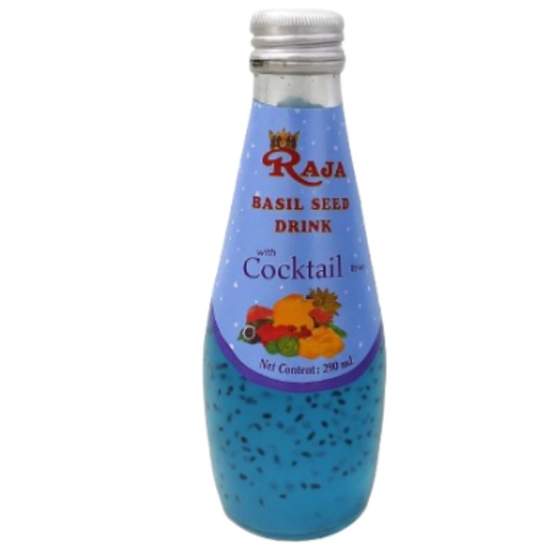 Raja Basil Seed Drink Cocktail is a delicious and refreshing beverage with basil seeds suspended in a fruity cocktail-flavored drink. It is hydrating and packed with natural fiber from basil seeds.