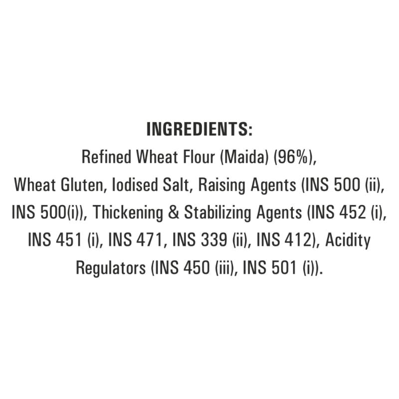 ‎Refined Wheat Flour (Maida) (96%), Wheat Gluten, iodized Salt, Raising Agents (INS 500 (ii), INS 500(i)), Thickening & Stabilizing Agents (INS 452 (i), INS 451 (i), INS 471, INS 339 (ii), INS412), Acidity, Regulators (INS 450 (iii), INS 501 (i)).